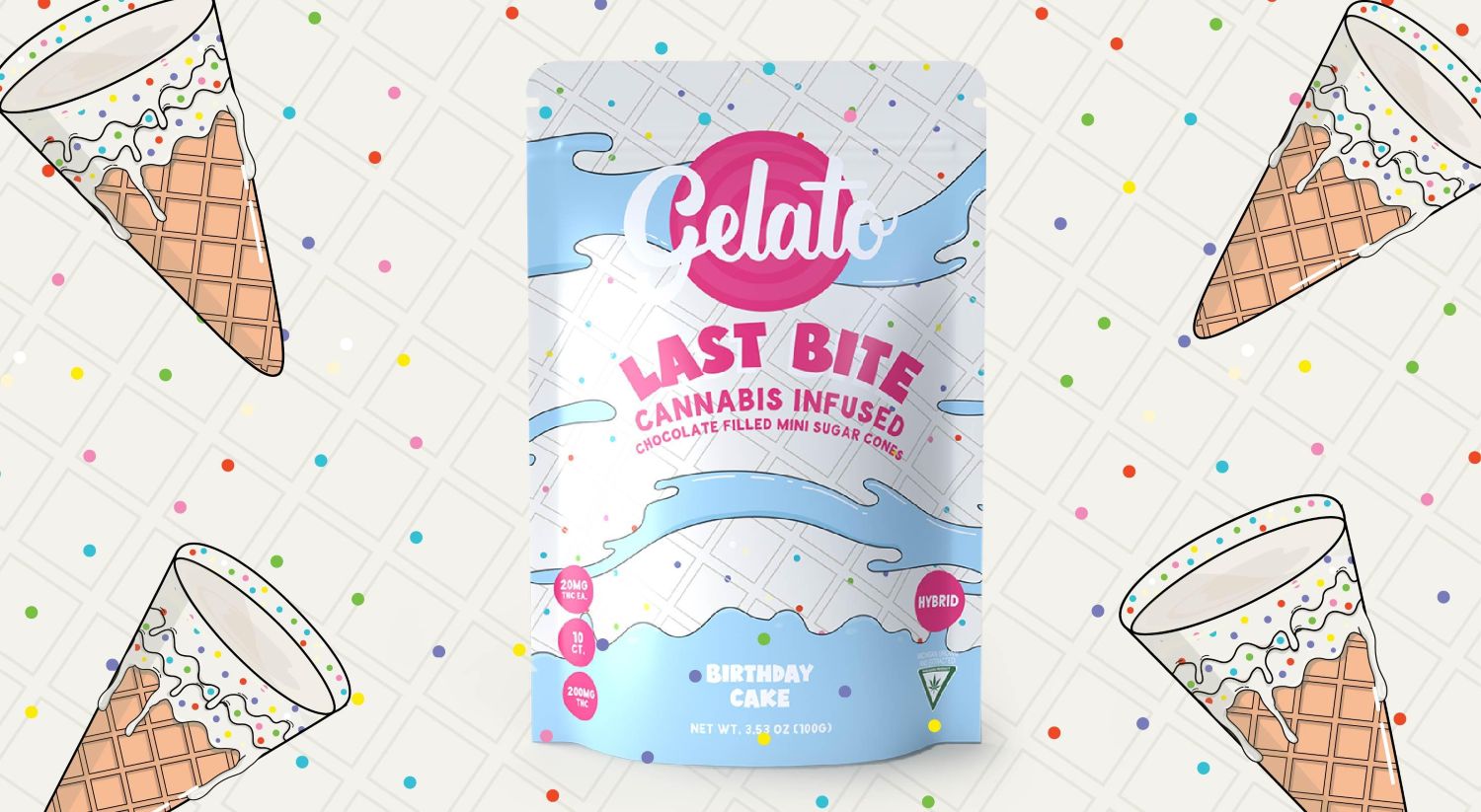 Celebrate every moment with Gelato Last Bite in Sugar Cone Birthday Cake. This delightful treat combines the creamy sweetness of birthday cake frosting, colorful sprinkles, and a crunchy sugar cone base for a festive flavor explosion. Infused with 200mg THC per package (10mg THC per piece), it delivers balanced effects that uplift your mood, spark creativity, and promote relaxation. Perfect for any occasion, this treat is a sweet way to elevate your cannabis experience.