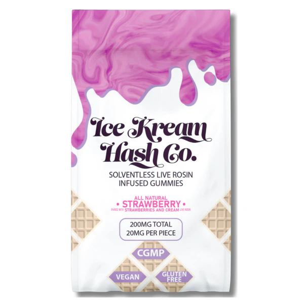 Introducing the All Natural Strawberry paired with Strawberries and Cream Solventless Live Rosin Infused Gummies by Ice Kream Hash Co., a delectable fusion of flavor and potency that redefines the cannabis edible experience. These gummies are a testament to Ice Kream Hash Co.'s commitment to quality, crafted with precision and passion to deliver an unparalleled product. Ice Kream Hash Co. consistently delivers unparalleled quality in every gram