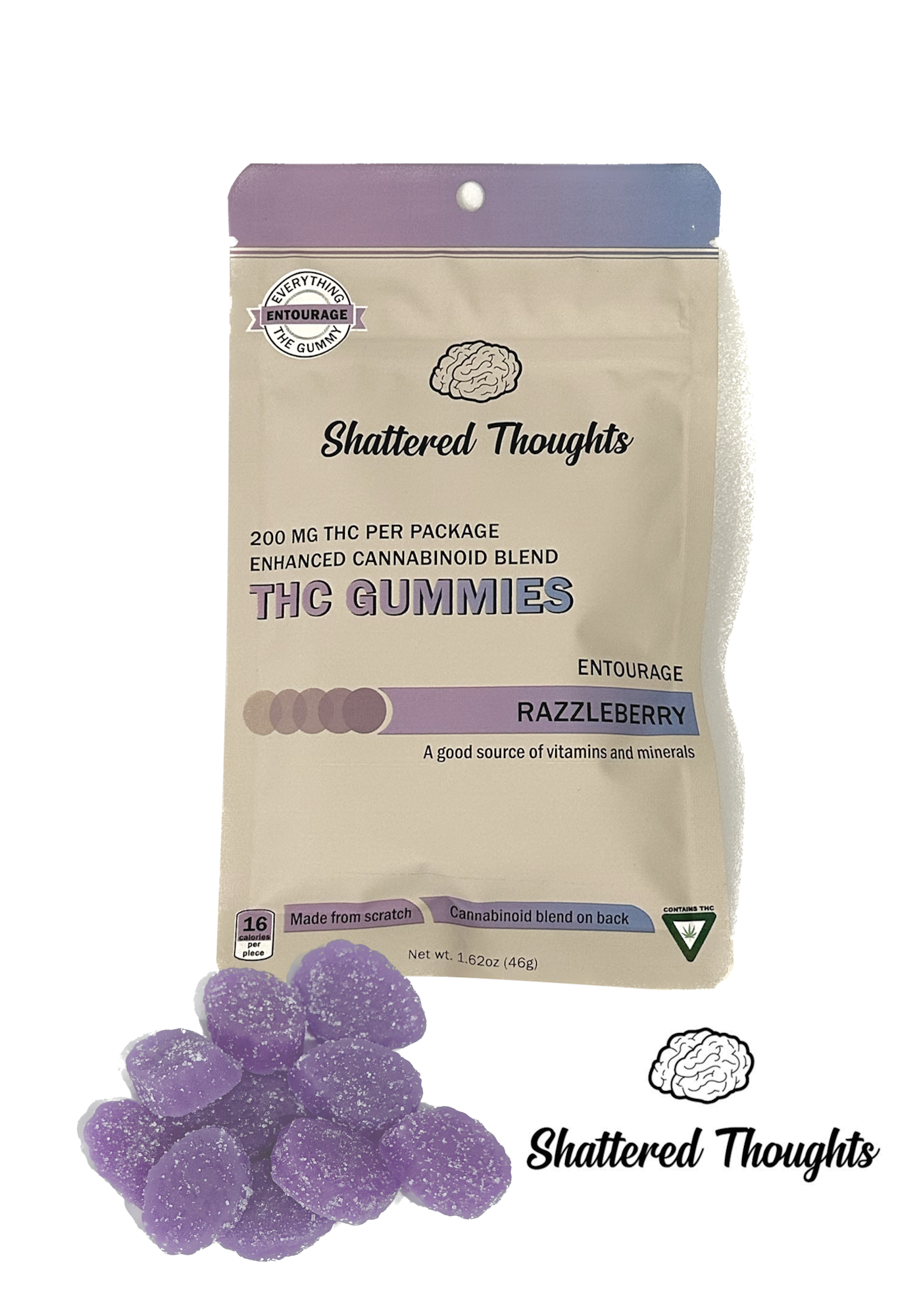 Shattered Thoughts 200mg Entourage Gummy Packs with the perfect infusion of 200mg THC and 40mg each of CBD, CBG, CBN, and CBC!