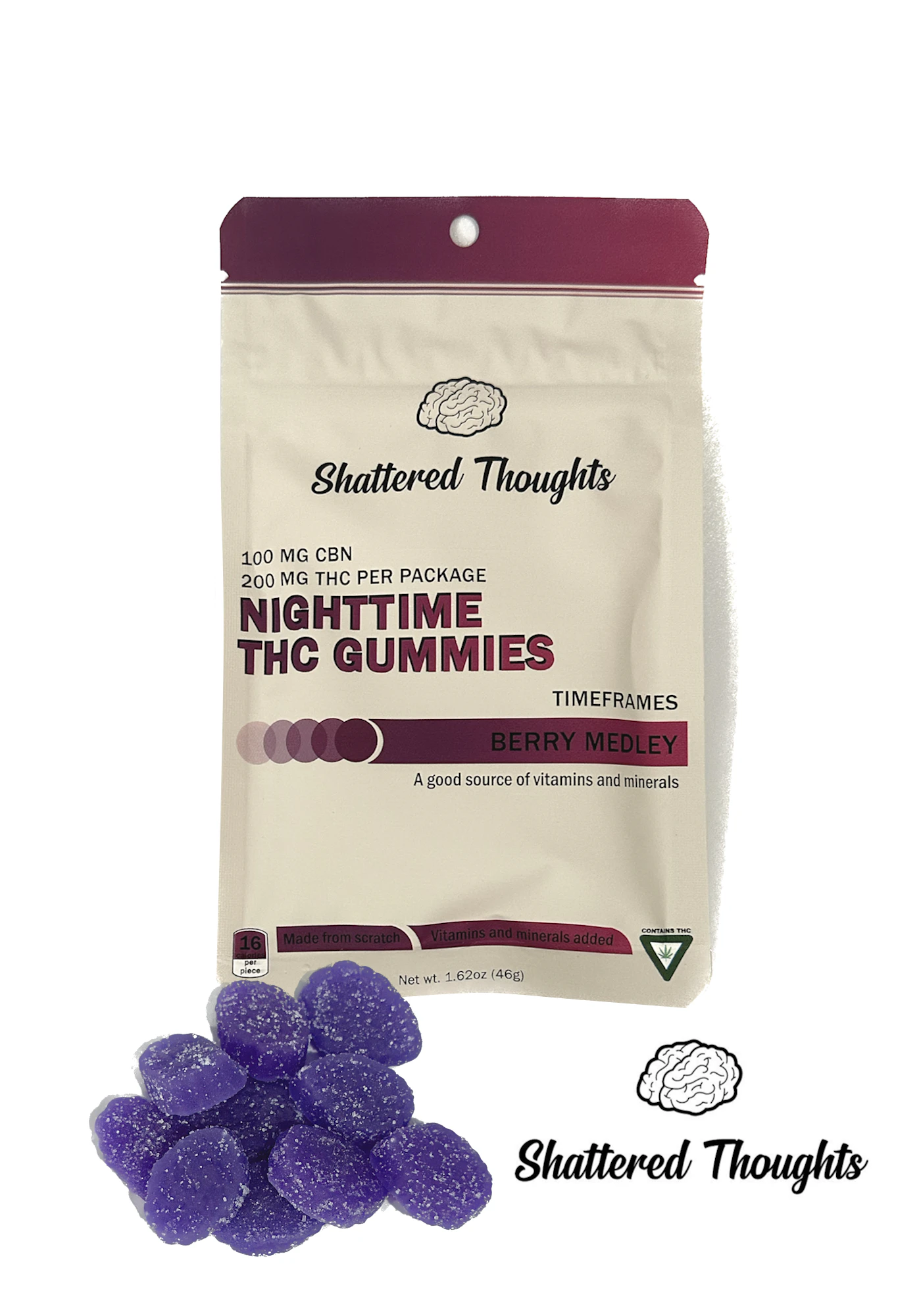 Shattered Thoughts Nighttime Gummies serve up sleep with 20mg THC and 10mg CBN in each piece (10 pieces/pack).